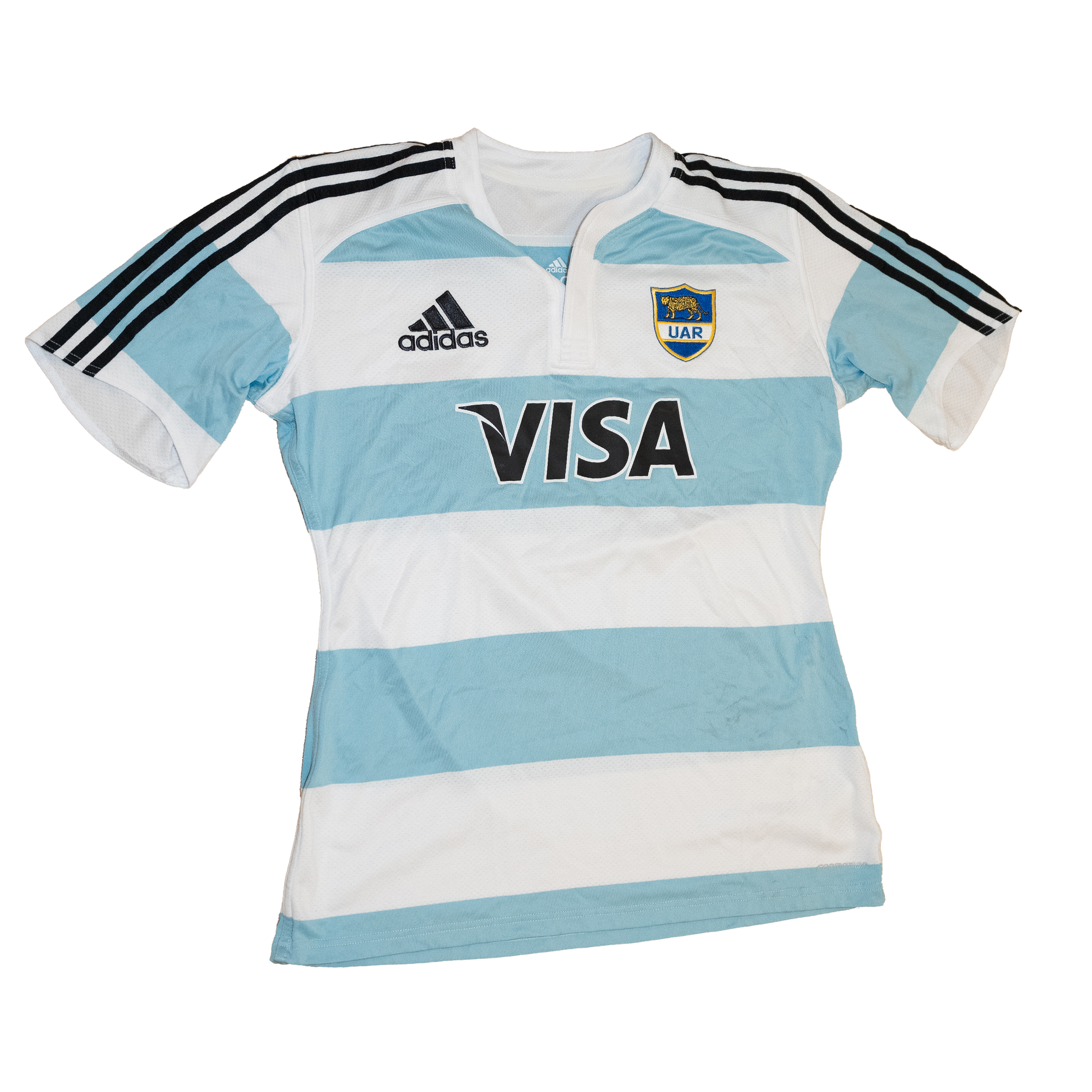 Manufactured by Adidas, the shirt features the classic sky-blue and white hoops with VISA sponsor branding and black numbering — a timeless design synonymous with Los Pumas’ powerful pack.
