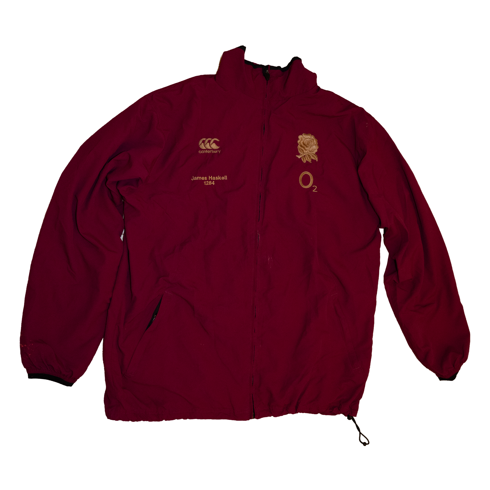 Crafted by Canterbury, this maroon full-zip jacket features the embroidered England rose, O₂ sponsor logo, and James Haskell’s player number (1284) stitched beneath the crest – marking his place in England Rugby history.
