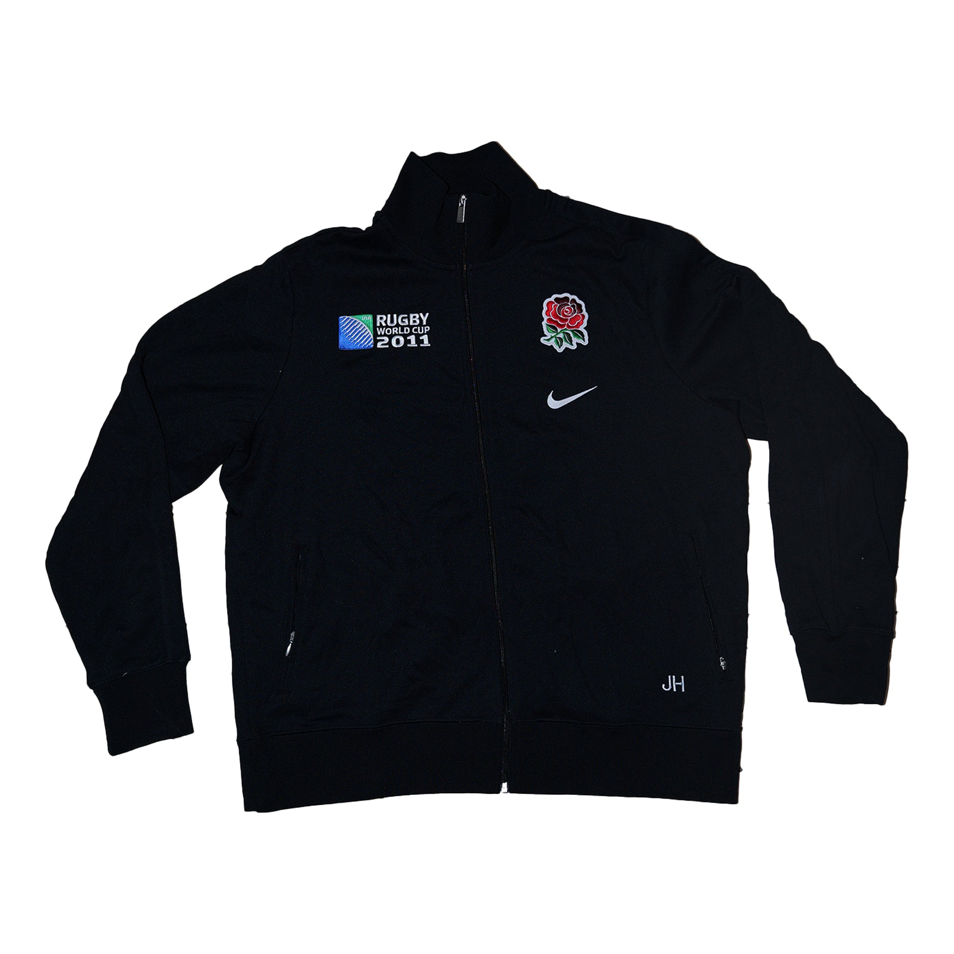 Straight from the tournament that captured the rugby world, this official England Rugby World Cup 2011 anthem jacket was worn by James Haskell. A clean, all-black full zip with embroidered Rugby World Cup 2011 logo, England rose, and Nike Swoosh on the front. The back features a bold “ENGLAND” across the shoulders, while “JH” initials are subtly stitched on the hem – confirming its original owner.