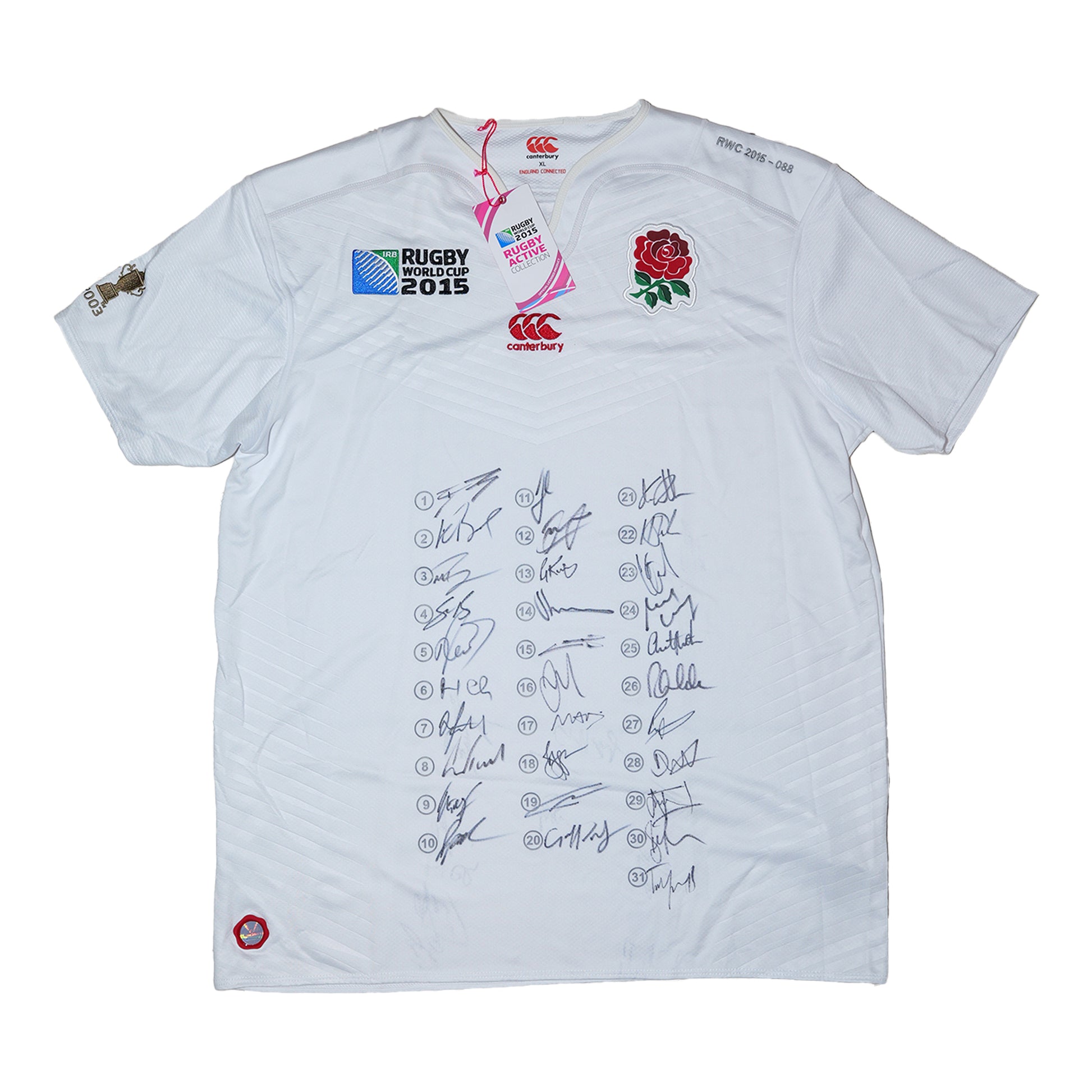 Own a genuine piece of Rugby World Cup history with this officially signed England 2015 RWC squad jersey, featuring the full set of 31 player signatures, each signed next to their squad number in the centre of the shirt.