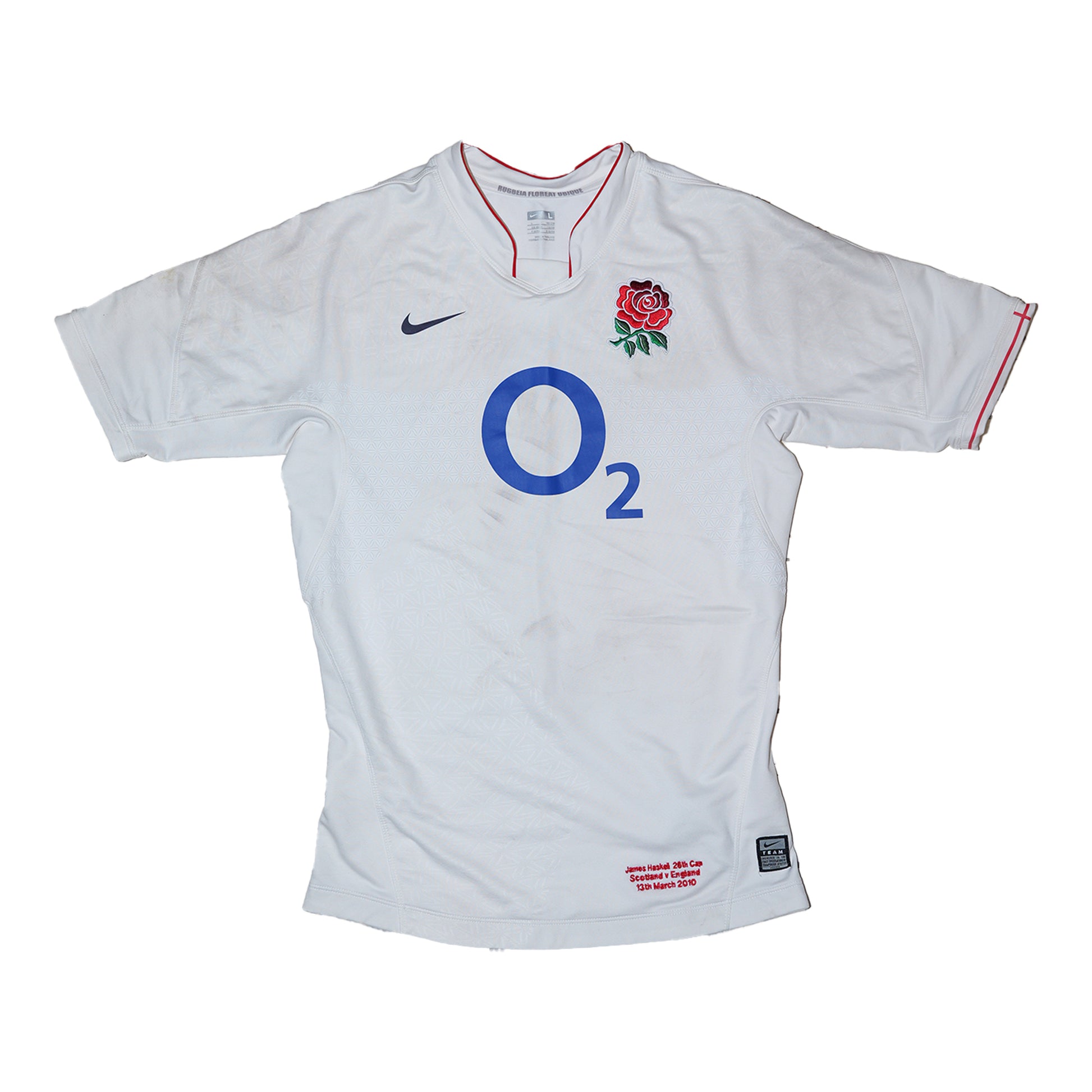This official England rugby shirt was issued to James Haskell for his 26th international cap against Scotland on 13th March 2010, during the Six Nations. It features embroidered match details on the front hem, Nike branding, and the number 6 printed on the back. Light signs of wear are visible across the fabric, consistent with handling or kit bag storage. Direct from James Haskell’s personal collection, this shirt offers fans and collectors a genuine piece of his international career.
