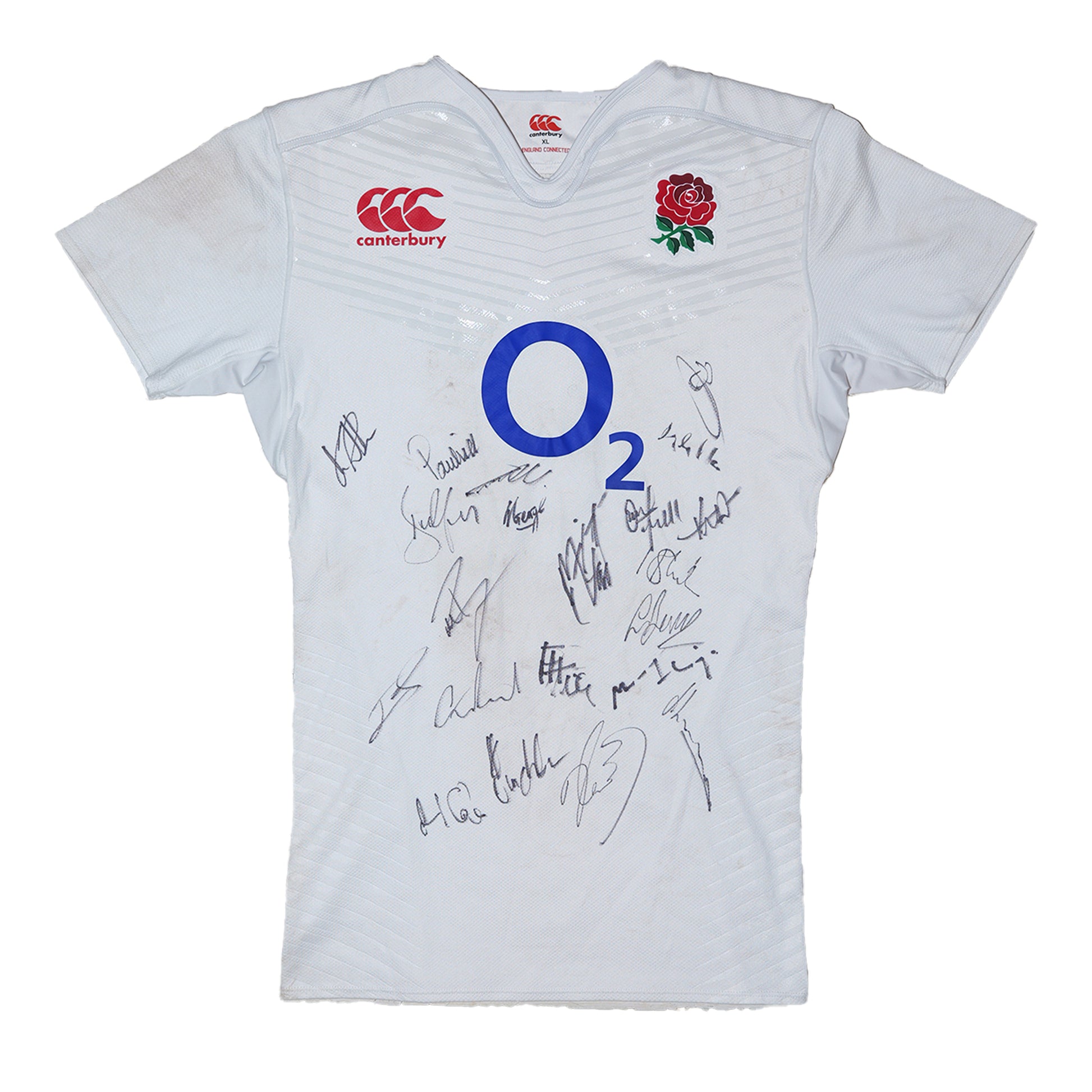 Official England rugby shirt signed by multiple squad members. Features authentic signatures on the front of the Canterbury home shirt with O2 sponsor. This collector’s item showcases signatures from a full team sheet, with visible signs of wear suggesting handling during a team event or signing session — but not worn in a match.